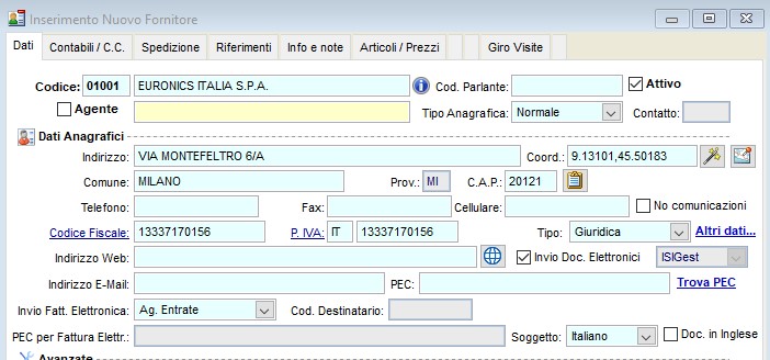 Una volta inserita la Partita IVA e cliccato il tasto Invio su tastiera, il software compilerà automaticamente l'anagrafica dell'azienda scelta.