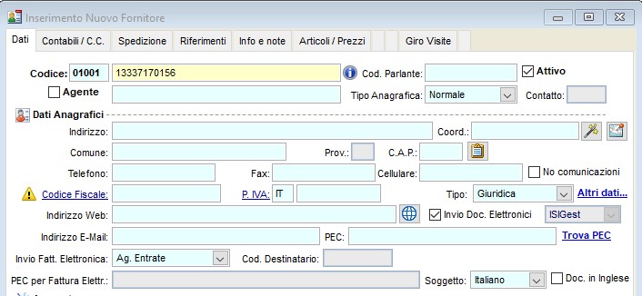 Nella schermata di inserimento del nuovo cliente/fornitore, posizionarsi nel campo della Ragione Sociale e inserire direttamente la Partita IVA dell'azienda che si vuole caricare.