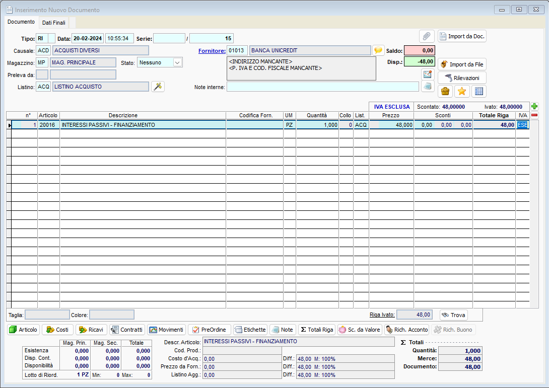 • Creare un nuovo documento di tipo RI (Ricevuta Fornitore), con la data della prima rata, inserendo nel corpo l'articolo “Interessi Passivi" con quantità 1 ed importo degli interessi di quella specifica rata