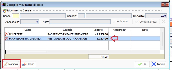 • Sulla seconda pagina, attraverso CASSE, modificare l'importo della QUOTA CAPITALE  selezionando la riga in questione e cliccando su modifica (sarà necessario modificare unicamente il campo importo)