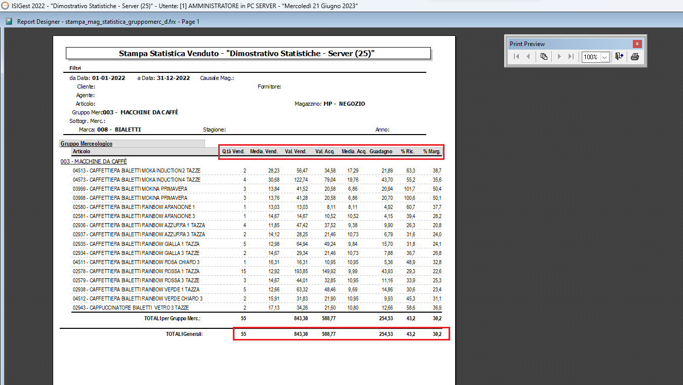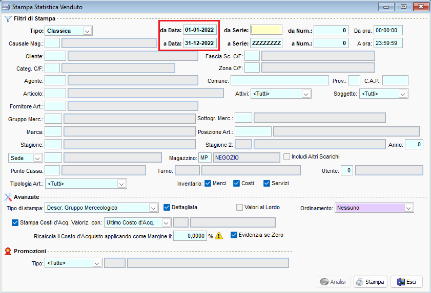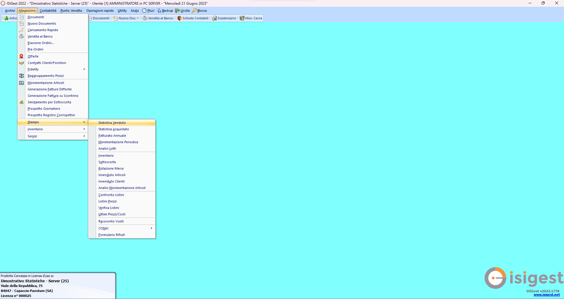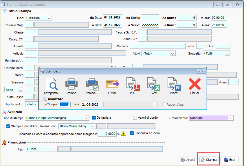Selezionare Magazzino > Stampe > Statistica Venduto