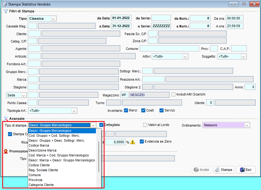Nel box Tipo di Stampa è possibile definire come visualizzare la statistica, ad esempio è possibile visualizzare i prodotti divisi per gruppo merceologico oppure in ordine alfabetico.